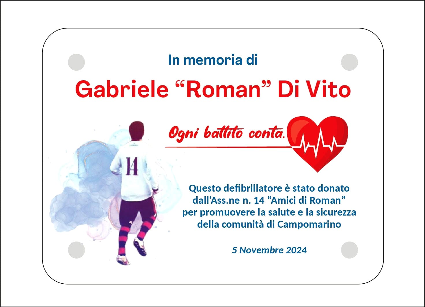 Roman ha sempre avuto a cuore le persone. Era uno di quelli che c’era sempre, che sapeva ascoltare, aiutare e rendere le giornate più leggere. Per questo, abbiamo sentito il bisogno di fare qualcosa di concreto per la comunità in suo nome, qualcosa che potesse fare la differenza davvero. Abbiamo donato un defibrillatore a Campomarino , un gesto semplice ma importante, che può salvare vite.